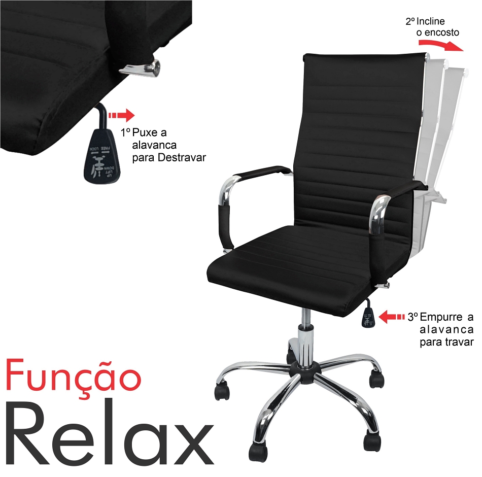 - Ajuste de altura com pistão pneumático e apoio de pés e costas